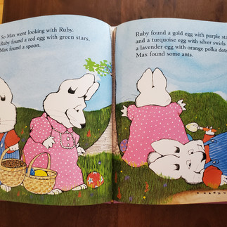 Basic plot: Max & his sister, Ruby, find a decadent chocolate chicken in the birdbath. They begin racing to find the most eggs & claim their prize. Two things become immediately clear – Max is hopeless at searching & Ruby is effortlessly bossy. An unexpected twist puts Ruby in her place.